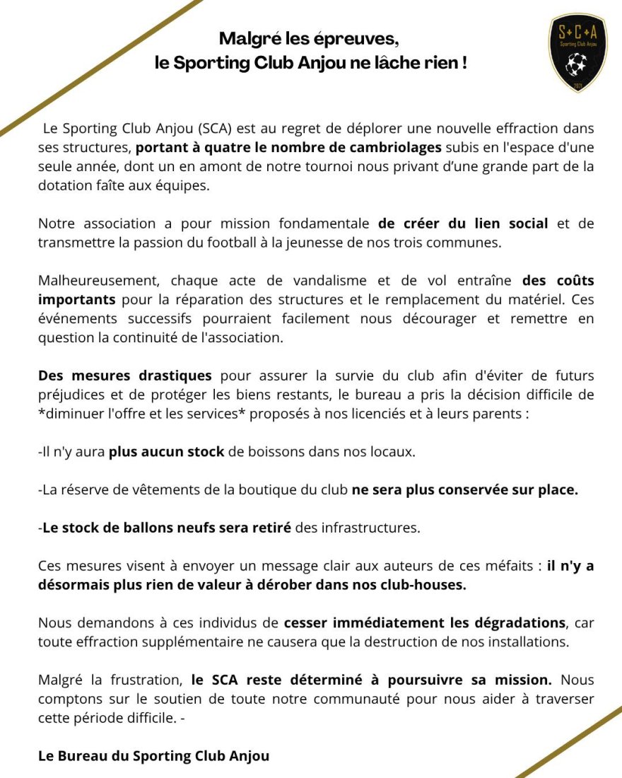 Le FC Chateau-Gontier apporte son soutien au club du SC Anjou suite aux nouvelles dégradations subies par le club.